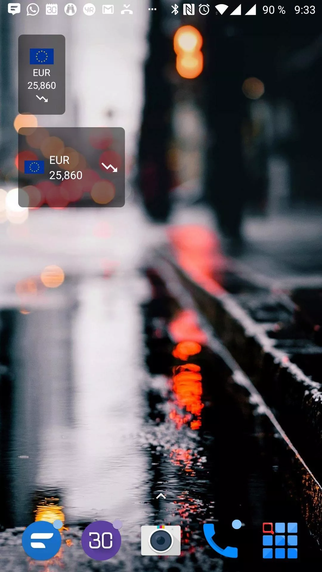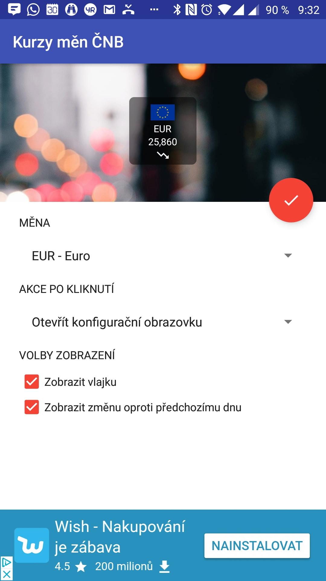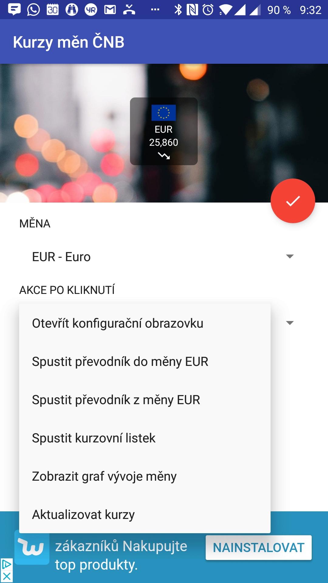 K dispozici jsou také dva widgety na domovskou obrazovku – o rozměrech 1×1 a 2×1. U obou lze zvolit požadovanou měnu, jejíž kurz bude zobrazován, nastavit jednu ze šesti akcí po klepnutí, vypnout/zapnout zobrazování vlajky a změny kurzu proti předchozímu dni.