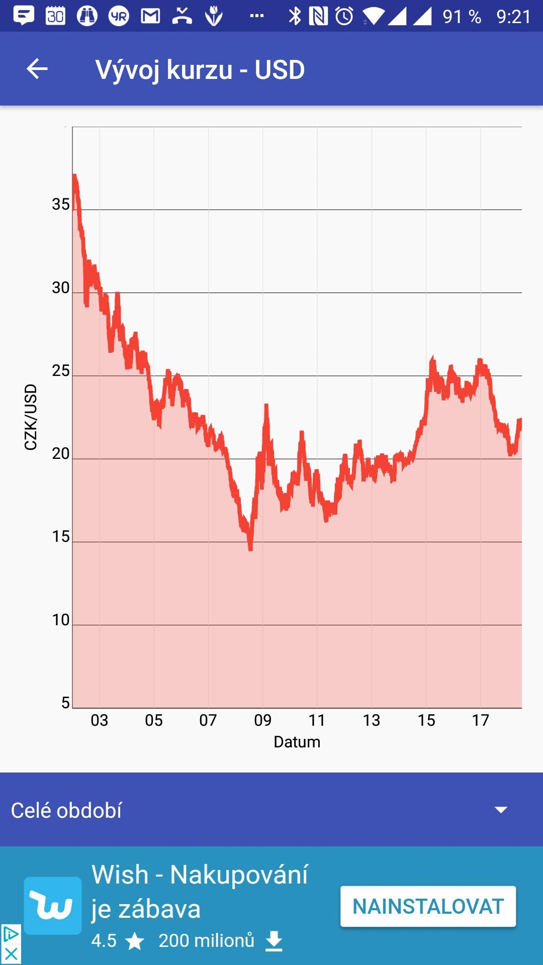 - Vývoj kurzu – zobrazí graf s vyobrazením vývoje kurzu dané měny vůči české koruně za vybrané období (7/14/30/60/90/180 dní/poslední rok/celé období).