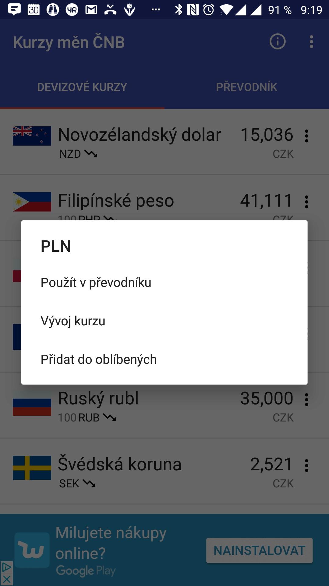 - Použít v převodníku – nastaví danou měnu jako výchozí pro převod.