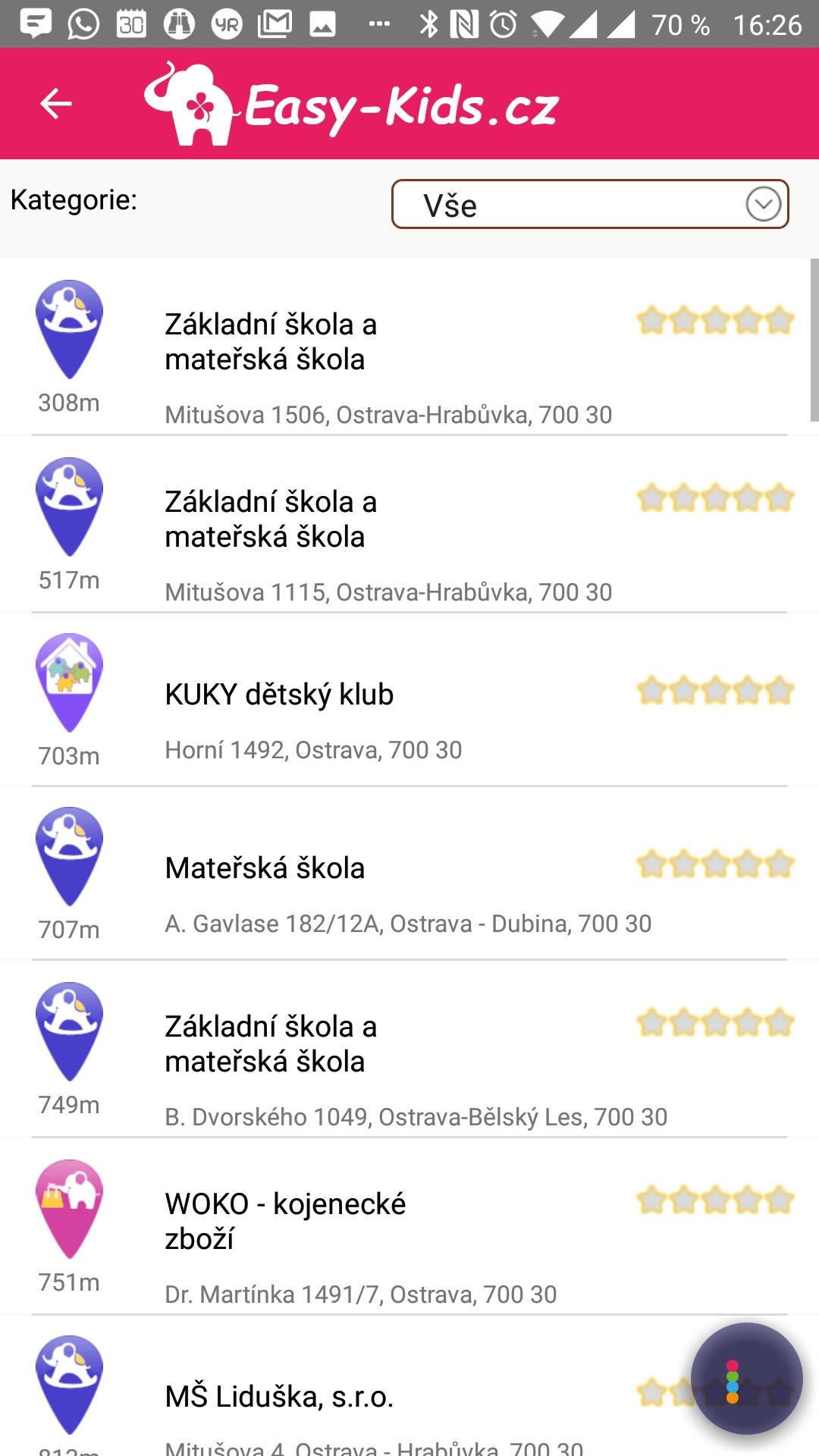 Na první pohled nás zaujal vysoký počet modrých ikon s houpacím slonem. Po klepnutí jsme zjistili, že se jedná o školky. Podle oficiálních stránek tvoří přitom drtivou většinu míst – ze 7861 položek jsou to v 5466 případech (70 %)školky. Následovat by (dle oficiálních čísel) měla dětská hřiště a parky, dětská centra a obchody.