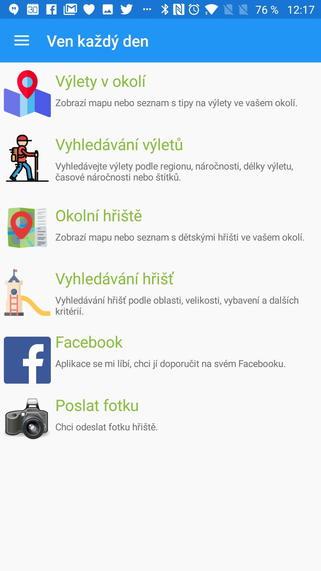 Zbývající nám dvě položky hlavní nabídky aplikace Ven každý den. Tlačítko Facebook slouží k možnosti sdílet aplikaci s přáteli na největší sociální síti. Celkem jasný je význam položky Poslat fotku, přes kterou můžete odeslat fotografii hřiště, aby se i ostatní uživatelé mohli podívat, jak vypadá. Postranní nabídka pak slouží k návštěvě webových a facebookových stránek aplikace.