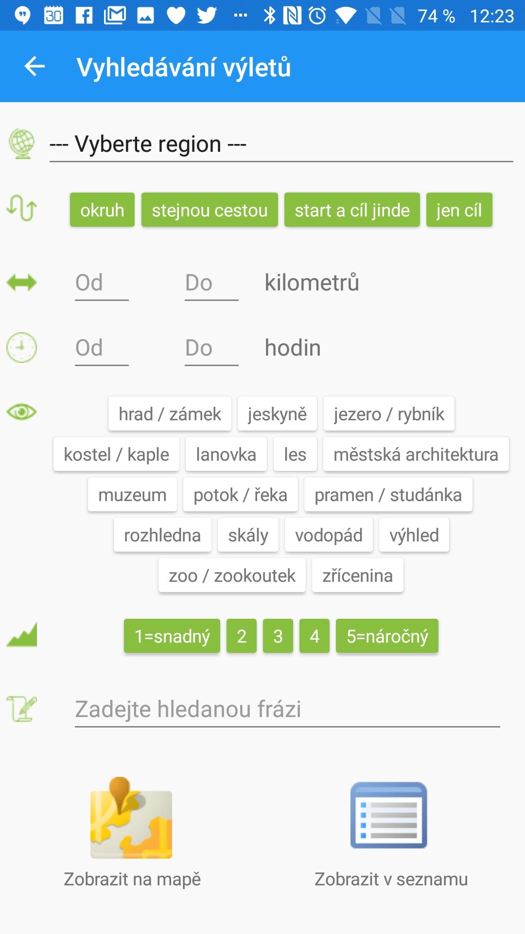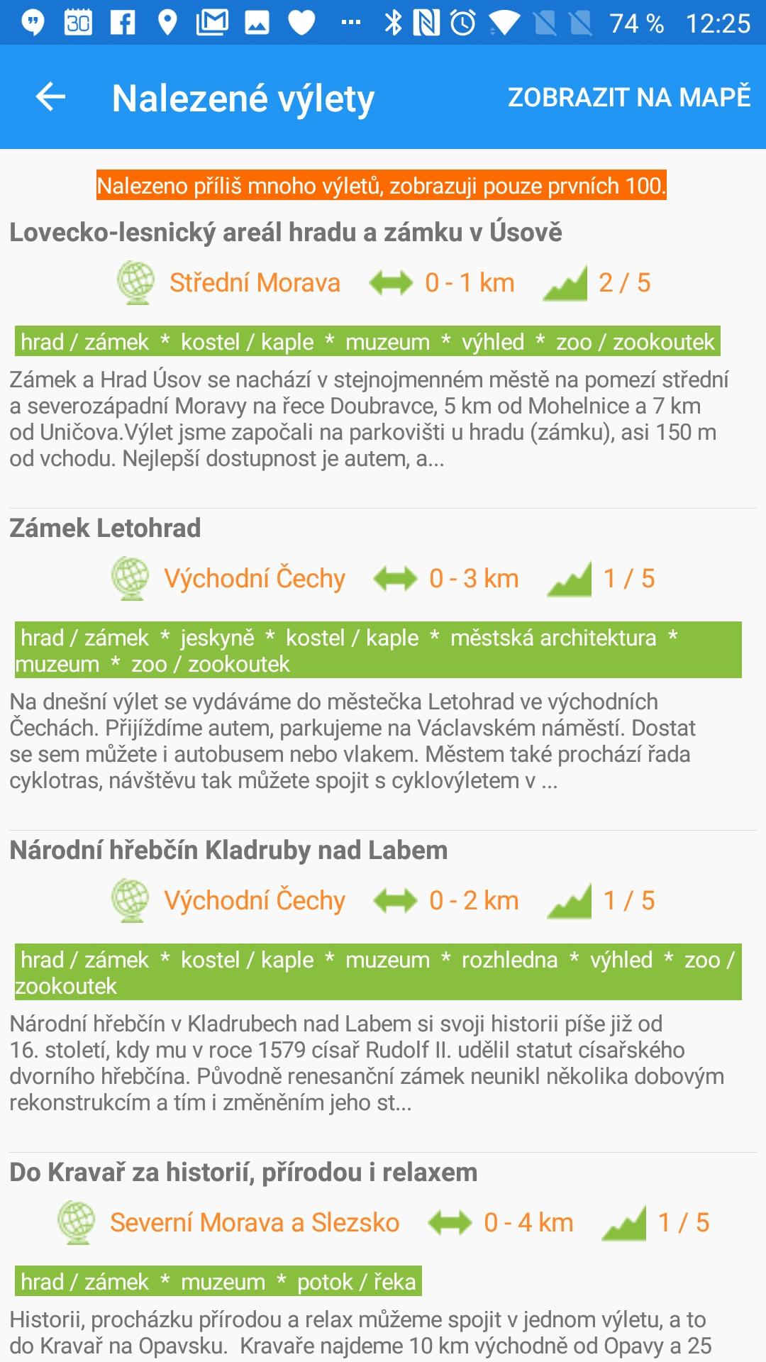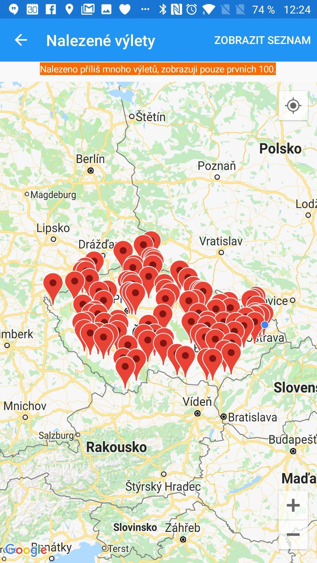 Druhá sekce Vyhledávání výletů se vám bude hodit, pokud máte chuť na nějaký konkrétní výlet. Můžete nastavit minimální a maximální vzdálenost, předpokládanou dobu trvání, typ výletu (hrad, zámek, jeskyně, jezero, rybník, lanovka, les, …) a náročnost. Aplikace poté buď v mapě, nebo v podobě seznamu zobrazí všechny výlety, odpovídající zadaným požadavkům. Nutno říci, že tato funkce se nám hodně líbí – stačí se rozhodnout, zda chcete s dětmi vidět hrad, nebo spíše oceníte procházku v lese, a během okamžiku dostanete tipy, odpovídající vašim představám.