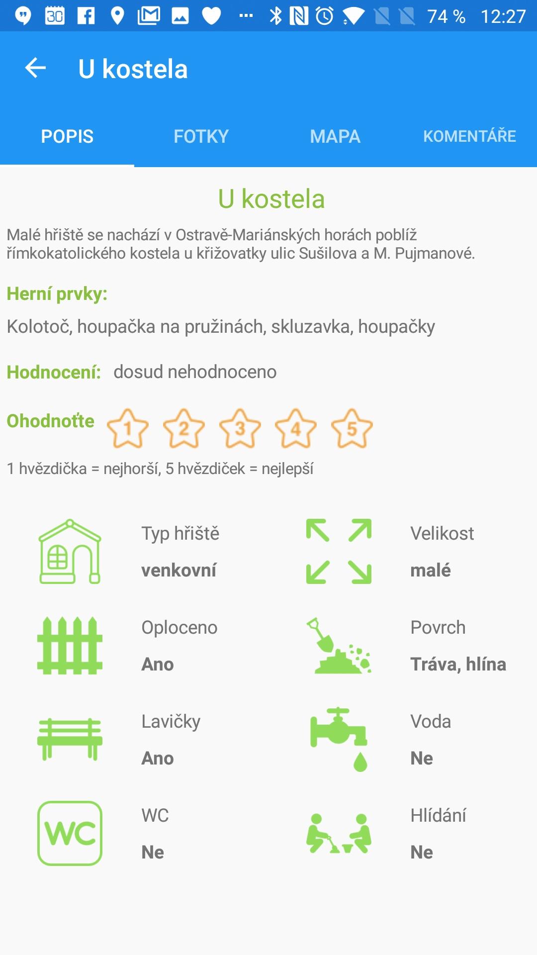 Pokud se vám zrovna nechce nikde chodit, ale přesto byste rádi zabavili svou ratolest, bude vás zajímat třetí sekce aplikace Ven každý den, nazvaná Okolní hřiště. Jak asi správně tušíte, poskytuje opět v mapách či v podobě seznamu přehled dětských hřišť. Nabízí skutečně nebývale podrobné údaje, čítající nejen stručný popis, ale například informace o vybavení, velikosti, povrchu, oplocení, dostupnosti laviček, vody a WC v blízkém okolí. I v tomto případě je k dispozici vyhledávání, umožňující hledat hřiště v rámci regionu podle toho, zda je kryté nebo venkovní a dle jeho velikosti.