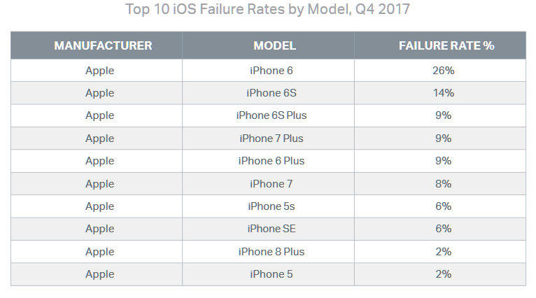 Zajímavé je na tom to, že jednotlivé Apple telefony jsou na tom mnohem hůře. Za stejné období má telefon iPhone 6 poruchovost 26 procent. Apple iPhone 6S měl 14 procent a následuje trojice iPhone 6S Plus, iPhone 7 Plus a iPhone 6 Plus, které mají 9 procent. Z toho jde vidět, že pokud plánujete koupi telefonu z druhé ruky. Bylo by dobré se vyhnout řadě iPhone 6, kde jsou ty problémy mnohem častější než u zbytku telefonů. Obecně řada iPhone 6 není moc povedená, právě tyto telefony byly hlavním účastníkem tzv. bendgate aféry, kdy se iPhone 6 ohýbal v kapse.